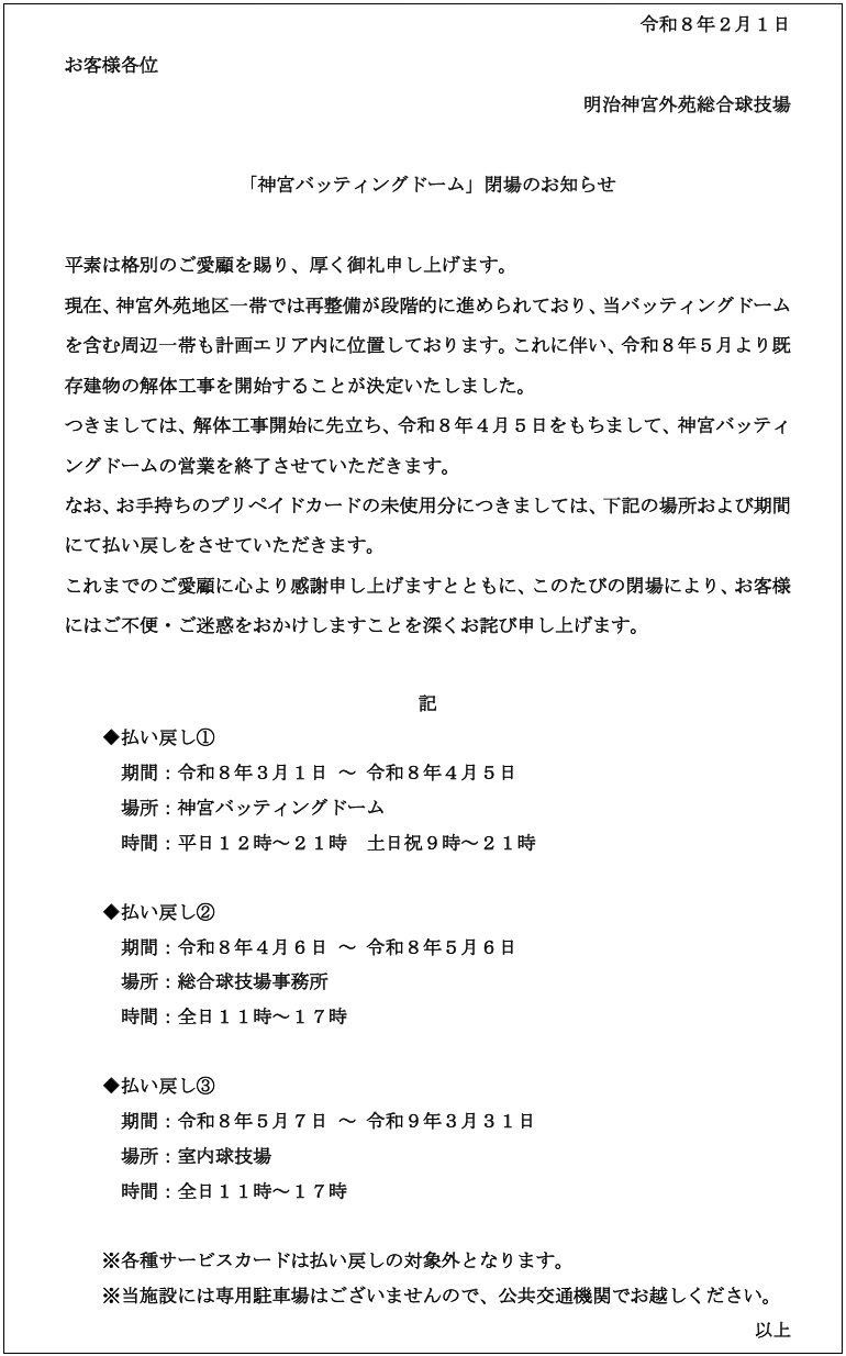 神宮バッティングドーム 閉場のお知らせ